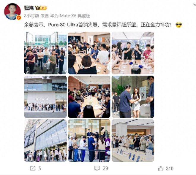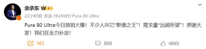 面對(duì)如此火爆的銷(xiāo)售場(chǎng)面,華為常務(wù)董事、終端BG董事長(zhǎng)余承東昨晚通過(guò)個(gè)人微博表達(dá)了感謝:“Pura 80 Ultra首銷(xiāo)盛況空前,被譽(yù)為‘影像之王’,需求量遠(yuǎn)遠(yuǎn)超出了我們的預(yù)期。衷心感謝大家的支持!目前,我們正加班加點(diǎn),全力組織補(bǔ)貨。”