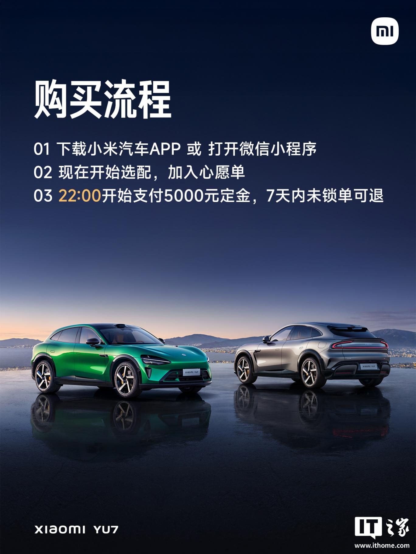 小米 YU7 汽車于 6 月 26 日晚 10 點開始支付 5000 元定金,7 天內未鎖單可退。還有少量“準現車”,6 月 26 日晚 10 點支付 2 萬元定金,支付即鎖單,無猶豫期,鎖單后預計 1-5 周交付。
