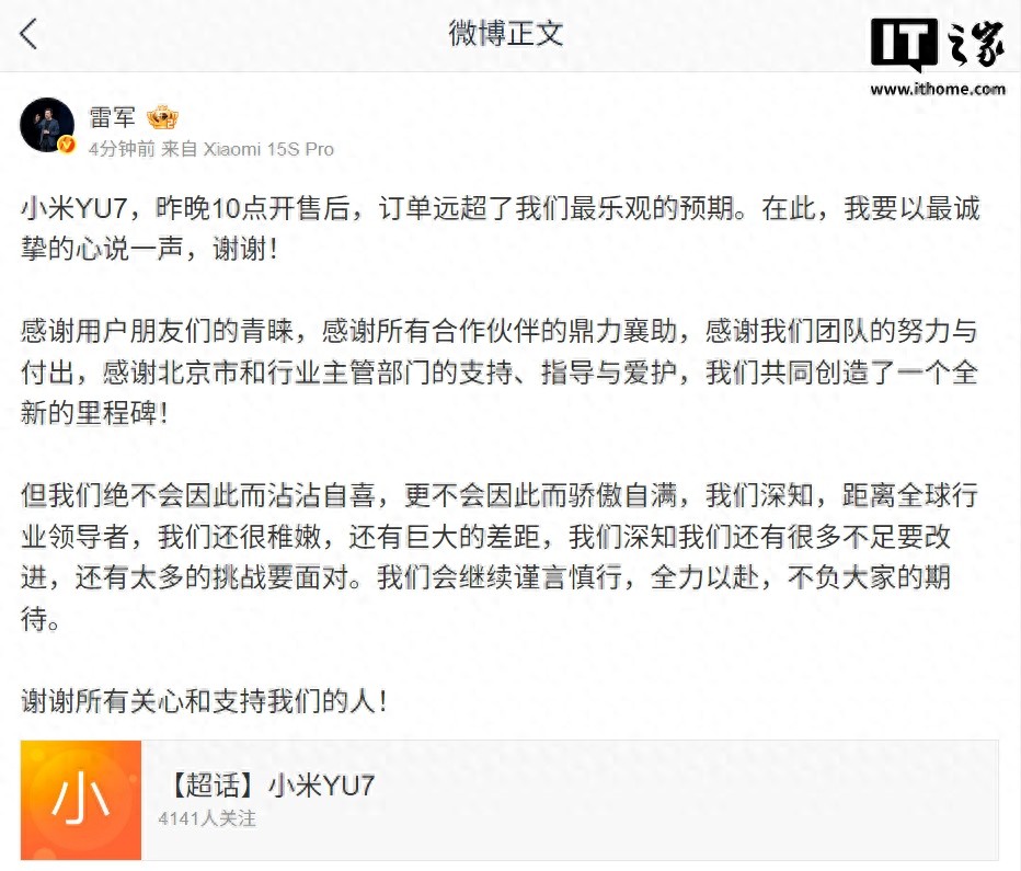 6 月 27 日消息,小米 YU7 于昨日晚間 10 點正式上市,現已開售 24 小時。小米創辦人、董事長兼 CEO 雷軍發文,稱小米 YU7 訂單遠超最樂觀預期,但絕不會因此而沾沾自喜。IT之家附全文: