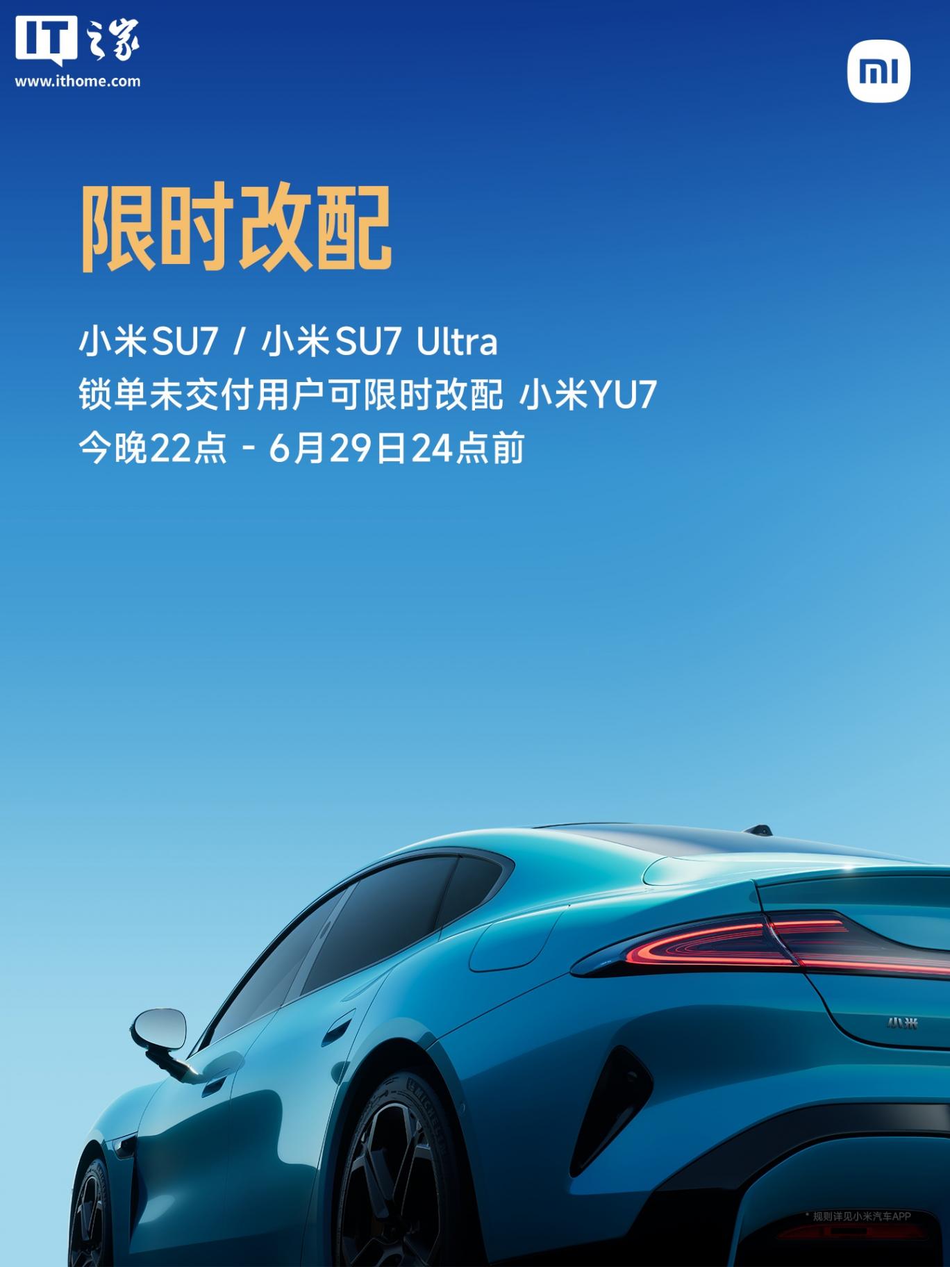 小米 SU7 / 小米 SU7 Ultra 鎖單未交付用戶,6 月 26 日晚 10 點 - 6 月 29 日晚 12 點前可限時改配小米 YU7。