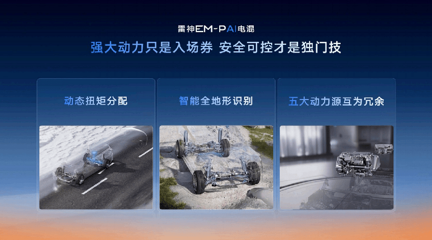 技術落地的數據更具顛覆性。雷神EM-i AI電混以47.26%的量產最高電混發動機熱效率為基底,搭載該技術的銀河A7在CLTC工況下百公里虧電油耗低至2.67L,媒體實測全路況油耗更降至2.49L/100km,綜合續航突破2100km。其P3電機功率達175kW,配合AI動力分配算法,滿電與虧電狀態下的加速差異控制在0.03秒內,徹底消除“饋電性能衰減”的用戶焦慮。對于追求性能的用戶,雷神EM-P AI電混以獨立三電機四驅構型達成4.5秒破百成績,同時保持4L級虧電油耗,其動態扭矩分配系統可在冰雪路面2毫秒內完成扭矩調整,安全性較傳統四驅提升40%。
