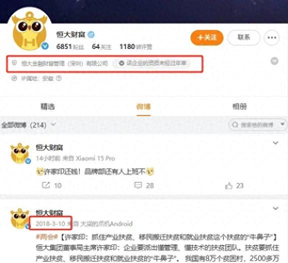 6月30日晚間,一則“許家印還錢!品牌部還有人上班不?”的微博引發廣泛關注,該內容來自認證為恒大金融財富管理(深圳)有限公司的“恒大財富”官方微博 ,而其上一次發布內容還停留在2018年3月,距今已有七年之久。