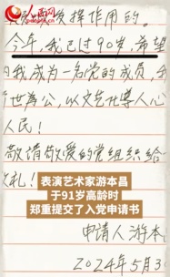 2024年5月30日,游老于91歲高齡時鄭重提交了入黨申請書。這份入黨申請書足足有21頁,一筆一劃工整有力,對黨的感情充盈于字里行間。