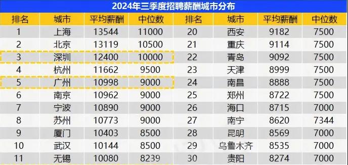 互為佐證的是,去年10月智聯招聘發布2024年第三季度《中國企業招聘薪酬報告》報告顯示,三季度38城企業平均招聘薪酬為10058元,環比季節性回落2.5%。當季深圳平均招聘月薪為12400元,位列全國第三,僅次于北京(1.31萬)和上海(1.35萬),略高于廣州和杭州。深圳薪酬中位數也剛超過了一萬元。