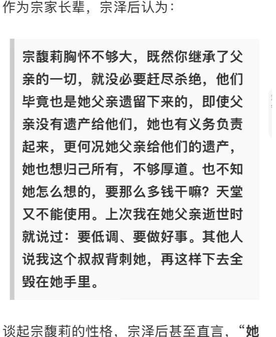 宗慶后的一位親戚—宗澤后,也在這時(shí)公開(kāi)發(fā)聲。他沒(méi)有在金錢(qián)上對(duì)這些孩子提供幫助,反而指責(zé)宗馥莉“自私”。他認(rèn)為宗馥莉作為姐姐,應(yīng)該主動(dòng)承擔(dān)起照顧這些弟弟妹妹的責(zé)任。