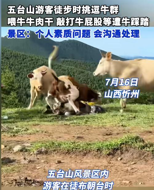 7月17日,有網友曝光了一個五臺山黃牛圍攻游客的視頻, 圍攻原因疑似因為游客給牛喂牛肉干,還戳牛屁股,這下真得說一個字:該!
