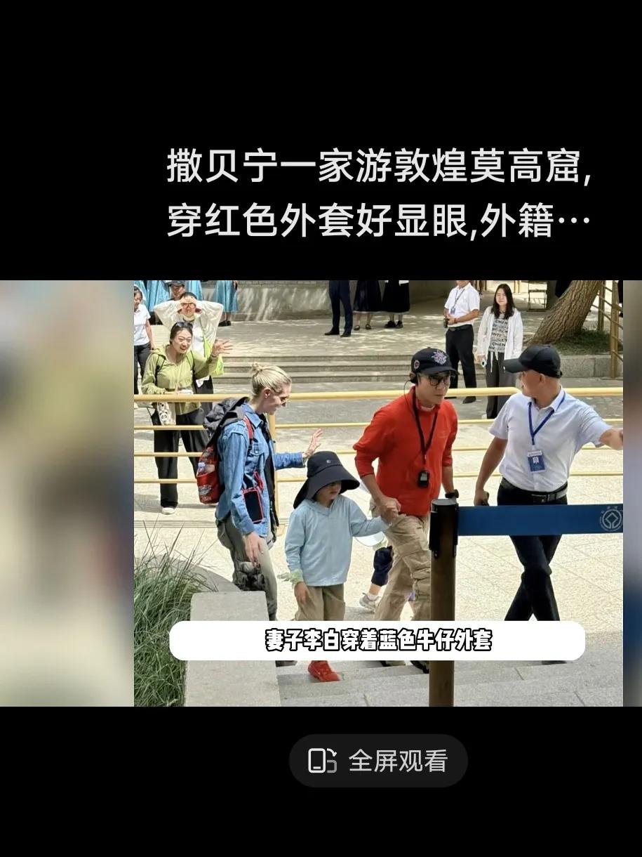 游客的鏡頭里,撒貝寧的紅色外套在人群中格外醒目,妻子李白則以藍色牛仔外套搭配高挑身材,金發扎成小揪揪,與丈夫形成“紅藍CP”的視覺反差。更引人注目的是,這對混血龍鳳胎雖未滿6歲,卻已顯露出遺傳自父母的優越身高,穿著同款上衣的兄妹倆,一個黏著爸爸撒嬌求抱,一個牽著媽媽的手好奇張望,將孩童的天真與莫高窟的厚重形成奇妙碰撞。