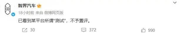 關于這場智駕測試,有兩家車企率先表態了,一個就是奇瑞和華為聯合打造的智界,它發了條微博,只有14個字——“已看到某平臺所謂‘測試’,不予置評。”