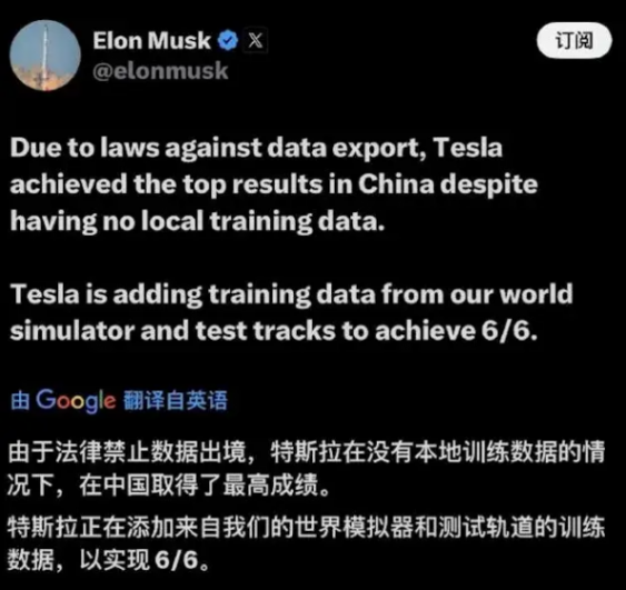 另一個就是遠在大洋彼岸的特斯拉,其CEO馬斯克發了個推文,一串英文總結下來就一句話:雖然我們沒有中國的道路數據,但我們依舊拿了第一名。
