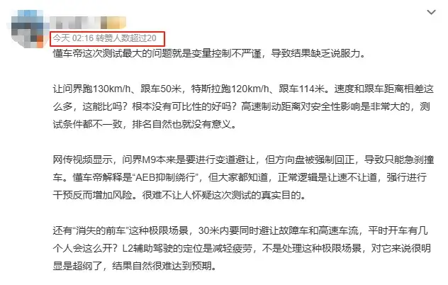 為了挽尊,華為的粉絲也使出了畢生之所學,質疑懂車帝在“消失的前車”中,把華為智駕的跟車距離設置得太近,最終華為在這一項測試中“全軍覆沒”。