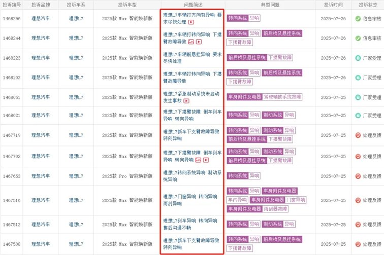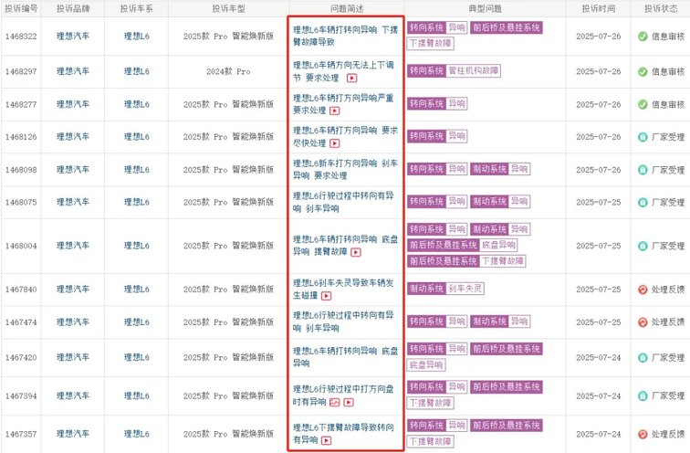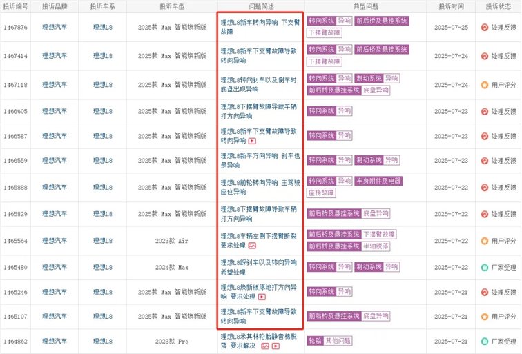 近日,來自專業汽車投訴網站的消息,理想 L 系列爆出大問題,多位車主投訴車型下擺臂異響,涉及 2025 款理想L全系列 L6、L7、L8 和 L9,但理想MEGA并沒有出現投訴。