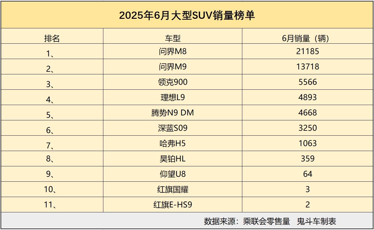 從當前銷量表現看,榜單上,僅有兩款車型銷量超過萬輛,其中,排名第一位的車型是問界M8,6月零售銷量達到21185輛,這款車型主打30萬-40萬級SUV市場,實際上,它跟理想L8同臺競技,智能、豪華方面料很足,銷量上可謂后來者居上,上市時間不長,直接拿下“銷冠”名號。