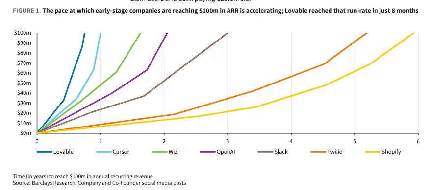 一家成立僅一年的AI建站工具Lovable正以前所未有的速度重塑網站開發市場。8月2日,據追風交易臺消息,巴克萊在最新研報中稱,AI建站工具Lovable在8個月內達到1億美元年度經常性收入(ARR),超越了Cursor等知名AI工具的增長速度,并在18億美元估值下完成2億美元A輪融資。