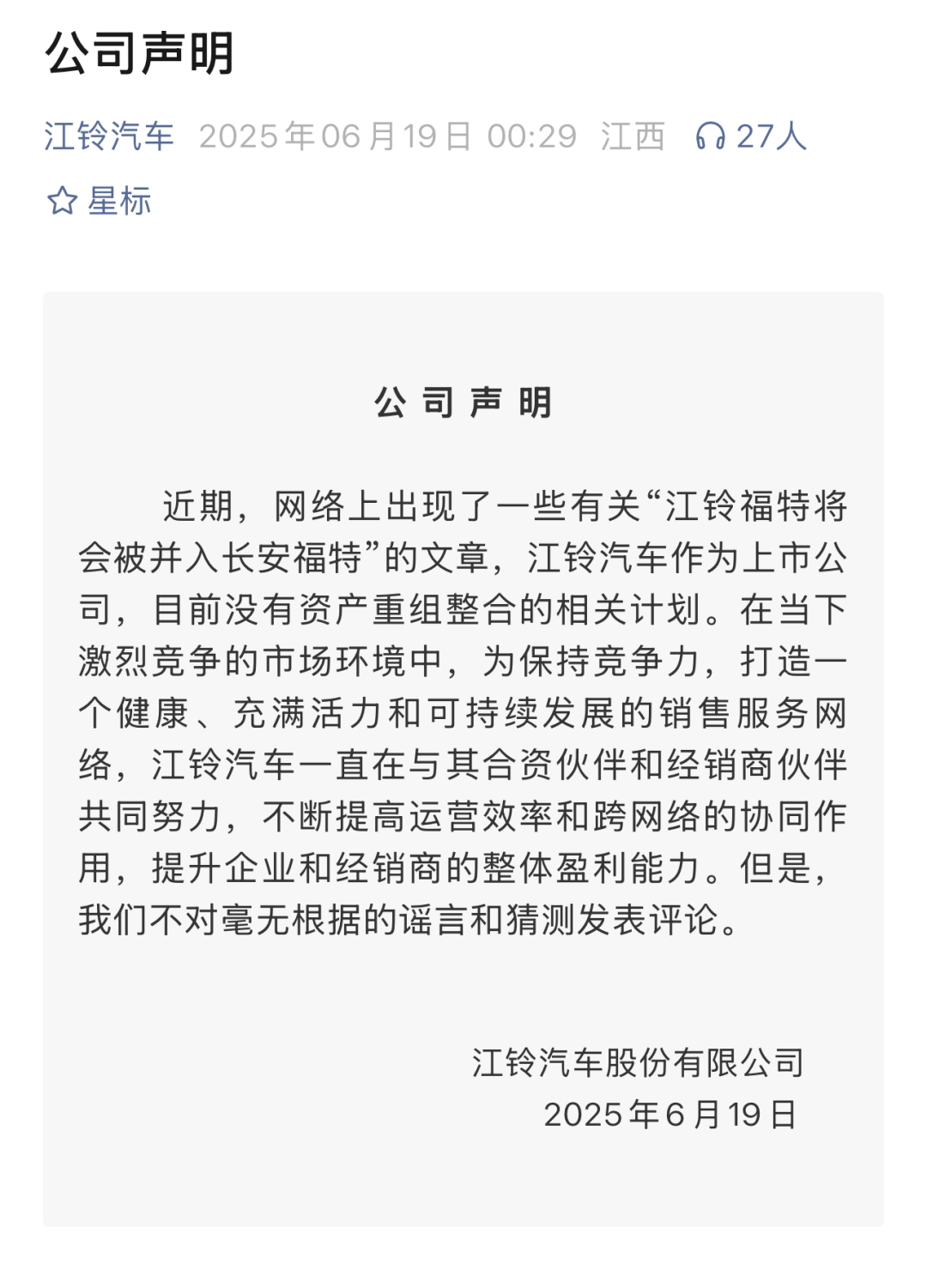 今年6月,有消息稱,長安福特與江鈴福特將進行公司層面的深度整合,但上市公司江鈴汽車迅速否認,稱“目前沒有資產重組整合的相關計劃”。不過,江鈴福特并未完全否定渠道共享與銷售協同的可能性。