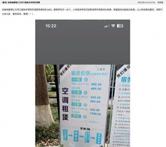 2025年8月,成都理工大學(xué)工程技術(shù)學(xué)院學(xué)生反映,宿舍空調(diào)需繳納四年租金1680元,費用遠超同類高校免費標(biāo)準(zhǔn),甚至接近購買新空調(diào)價格(1.5匹掛機約1500-2000元)。該事件引發(fā)全網(wǎng)對高校后勤服務(wù)外包模式的質(zhì)疑,學(xué)生呼吁免費使用空調(diào)的訴求持續(xù)發(fā)酵。