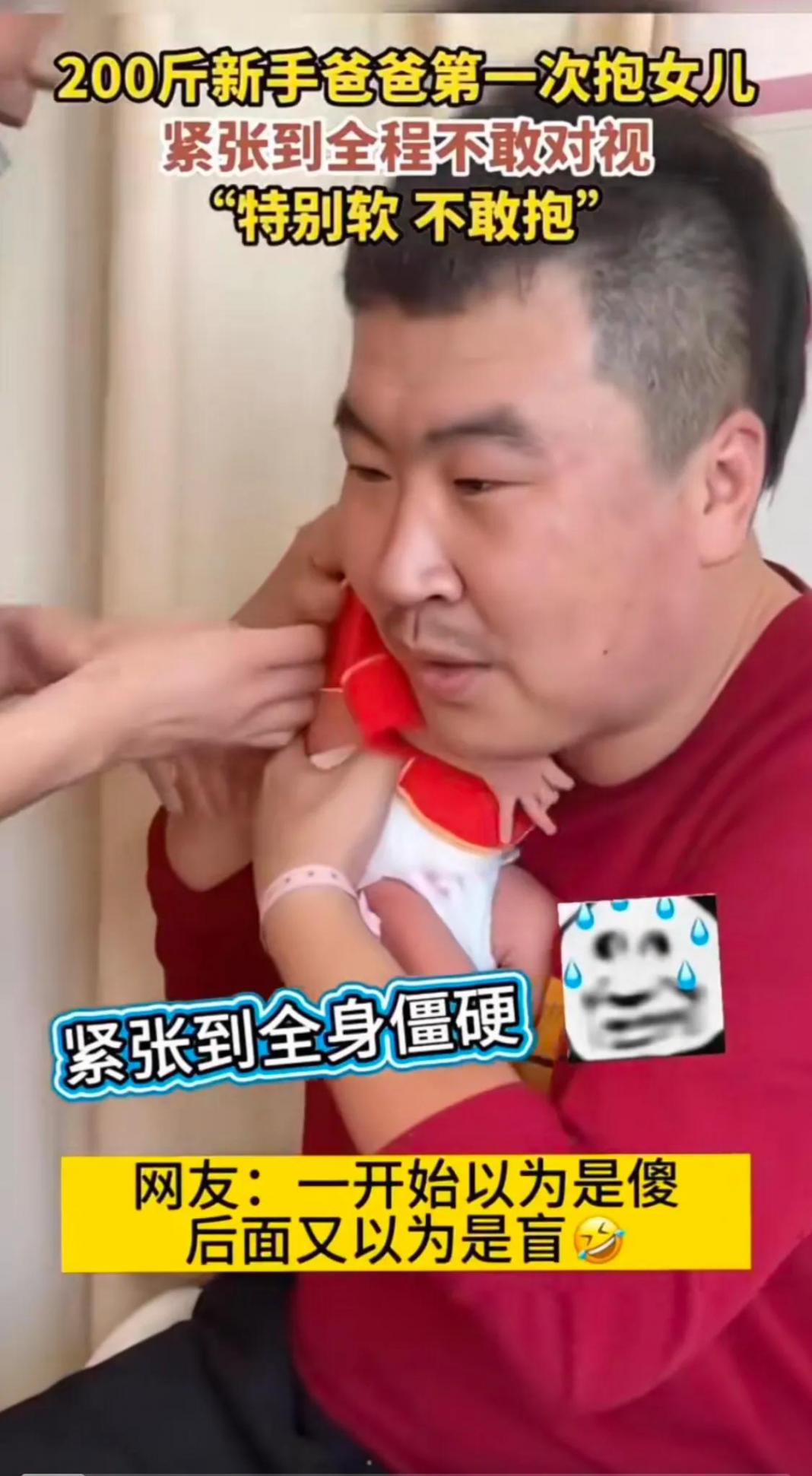 視頻里,這位爸爸小心翼翼地接過剛出生的寶寶,動作僵硬得像在拆炸彈。手不知道該往哪放,眼神里寫滿了“我怕摔了”,整個人緊張到不行。寶寶在他懷里,看起來比他還淡定。旁邊的人看得直樂,彈幕瞬間炸了:“這是我老公沒錯了!”“全國統一抱娃姿勢,笑不活了!”