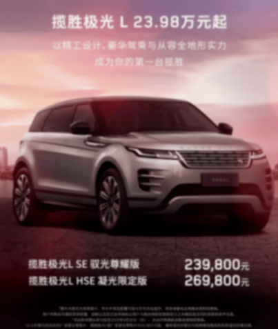 日前,奇瑞捷豹路虎官方宣布,攬勝極光L在2025年9月30日前開啟限時(shí)折扣售價(jià),其中攬勝激光L SE馭光尊耀版限時(shí)售價(jià)23.98萬元,HSE凝光限定版限時(shí)售26.98萬元,作為參考,上述兩個(gè)車款指導(dǎo)價(jià)分別為42.98萬元及47.58萬元。該車采用2.0T+48V輕混系統(tǒng),匹配9AT變速箱以及四驅(qū)系統(tǒng)。