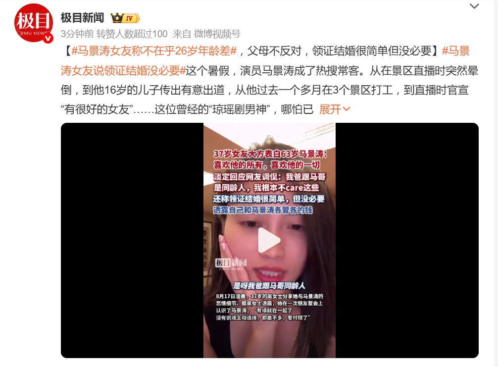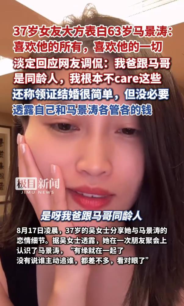 8月17日凌晨,馬景濤的37歲女友吳女士在直播中火力全開,正面硬剛網友對她和63歲馬景濤“父女戀”的調侃:“我爸跟馬哥是同齡人,我根本不care這些!”這波“年齡差算啥,真愛無敵”的宣言,瞬間讓評論區炸了鍋。