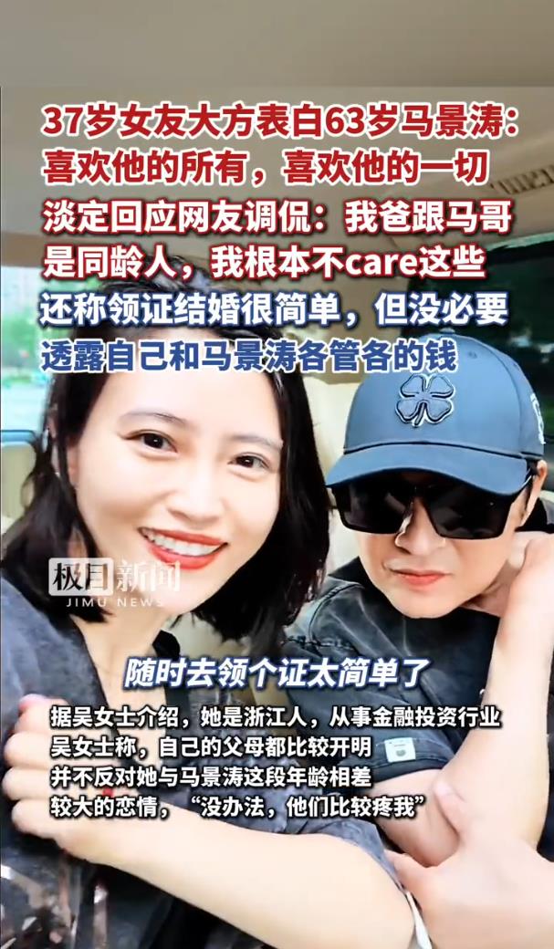 吳女士透露,兩人是在朋友聚會上認識的,“有緣就在一起了”。更讓人意外的是,她直言馬景濤是她的“兒時男神”,喜歡他的一切。而她的父母雖然和馬景濤同齡,卻對這段戀情持開放態度,“沒辦法,他們比較疼我”。網友調侃:“這大概就是‘你爸的兄弟成了你老公’的現實版?”