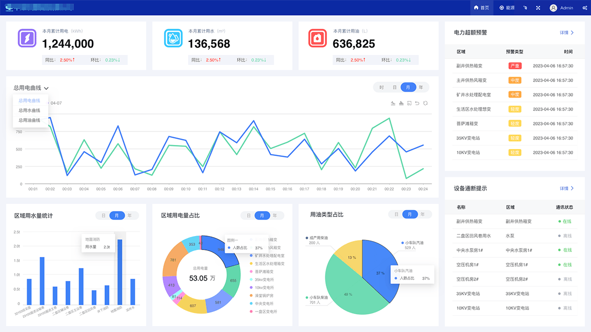 對企業(yè)總體能耗進行統(tǒng)計分析,展示用能量、能源結構、成本構成及變化趨勢,全面反映能源分配與消費之間的平衡關系,為能源規(guī)劃與政策制定提供依據。