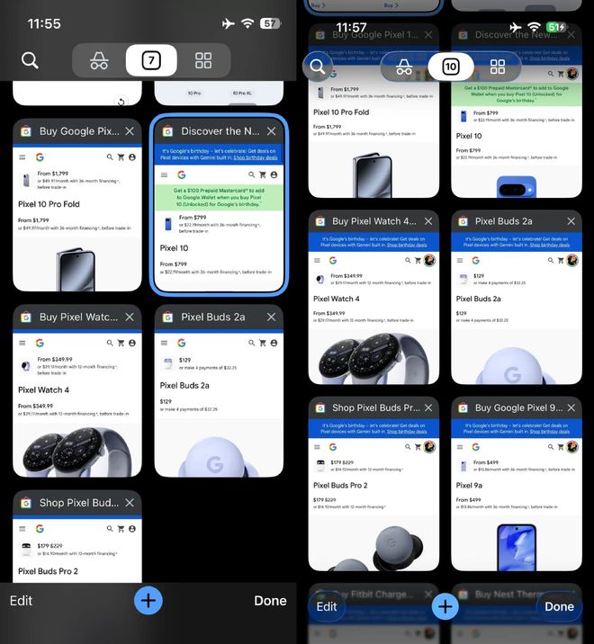 - 標(biāo)簽頁網(wǎng)格界面:無痕模式、標(biāo)簽頁切換、標(biāo)簽組切換以及左側(cè)的搜索功能均采用新樣式,“編輯”和“完成”按鈕也同步調(diào)整。