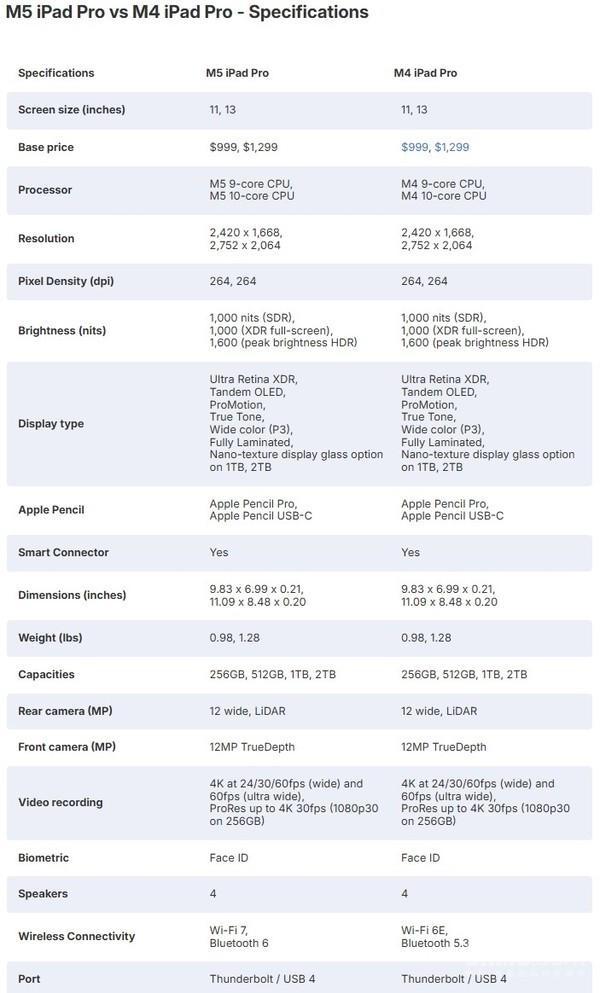 M5 iPad Pro起售價(jià)保持不變(11英寸8999元/13英寸11499元),各容量檔位價(jià)格與M4一致。蜂窩版本仍需額外支付1700元,納米紋理玻璃選項(xiàng)僅限1TB/2TB版本,收費(fèi)800元。