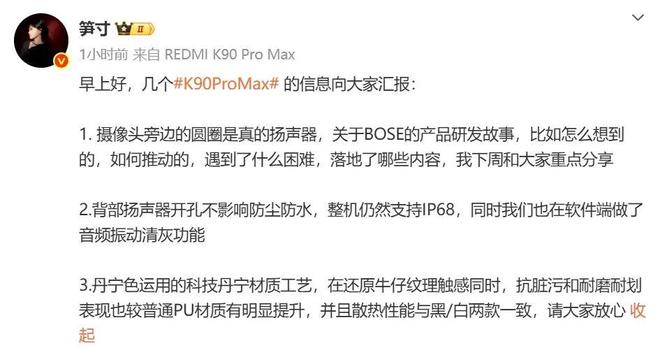 同時,她還透露REDMI K90 Pro Max 手機“攝像頭旁邊的圓圈”是真的揚聲器,背部揚聲器開孔不影響防塵防水,整機仍然支持 IP68,并且還在軟件端做了音頻振動清灰功能。