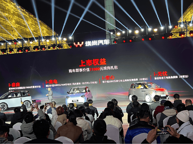 購車可享11000元埃尚禮包,包含i-自由、i-來電、i-安心、i-無憂四項禮包,分別對應:3000元金融補貼/3000元置換補貼(二選一);3000元7kW充電樁/風尚套裝‘自行車+充電槍’(二選一);3000元首任車主終身免費保養(非營運);首任車主三電終身質保(非營運)。