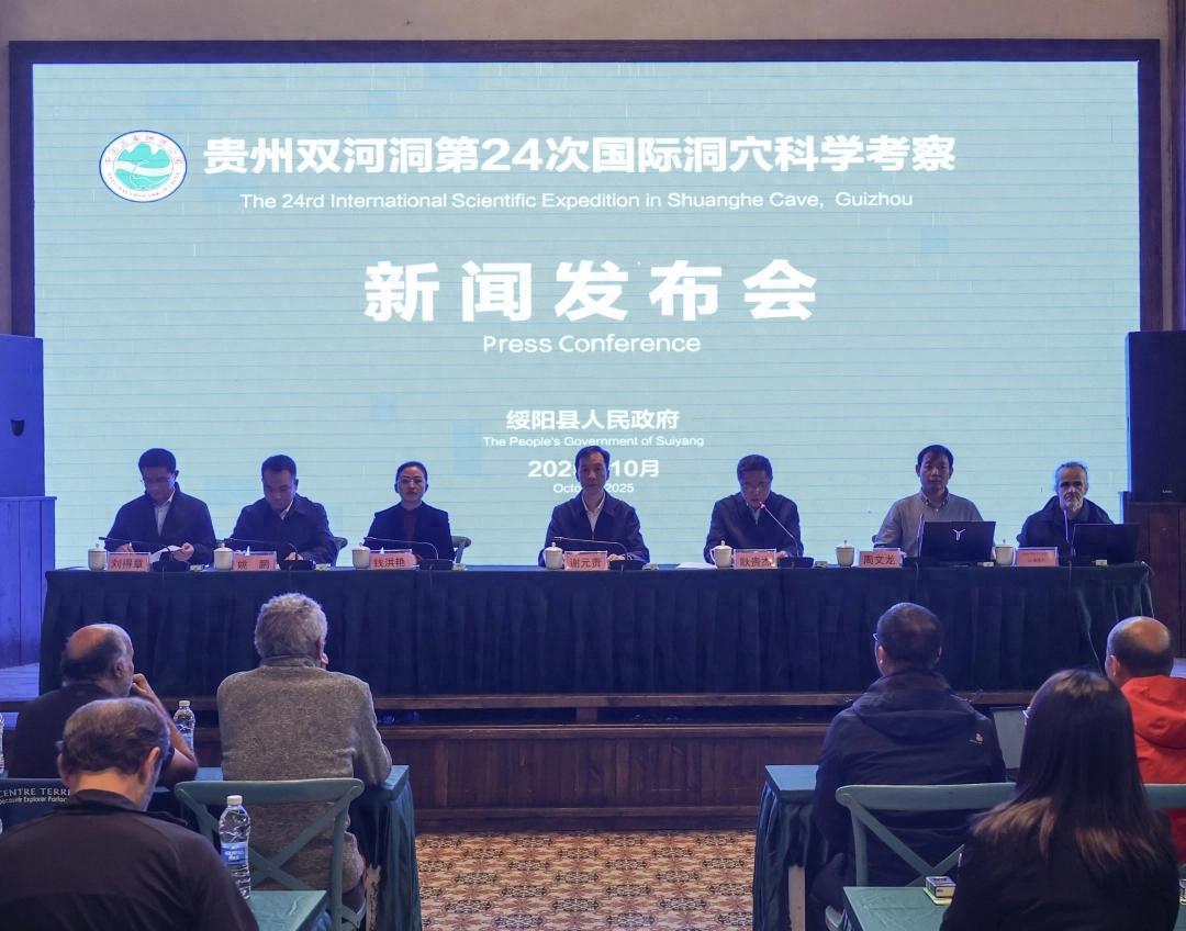 10月24日,貴州綏陽雙河洞第24次國際洞穴科學考察成果發布會在雙河洞國家地質公園舉行。本次活動由綏陽縣人民政府與貴州科學院院屬貴州省山地資源研究所共同主辦。貴州省山地資源研究所黨委委員、副所長周文龍與法國洞穴聯盟駐中國代表讓·波塔西聯合發布了最新探測數據與科研成果。來自綏陽縣、貴州省山地資源研究所的相關負責人,中外洞穴科考專家及多家媒體記者共同參會。