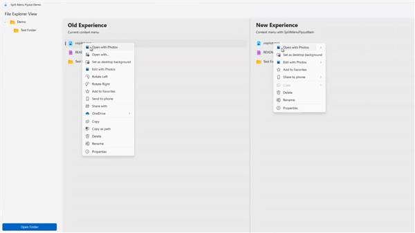 微軟的解決方案是引入“拆分式右鍵菜單”,核心是通過一種名為SplitMenuFlyoutItem的新API,將一個菜單條目拆分為一個主要操作和多個次要選項,次要選項將顯示在一個單獨的小型側面板中。