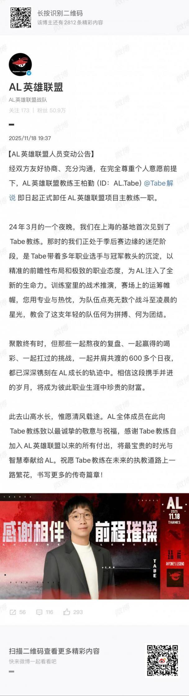 2025年LPL冬季轉會期剛拉開大幕,就迎來重磅炸彈——11月18日晚間,AL電子競技俱樂部官方發布公告,宣布與主教練Tabe達成友好協商,正式終止合作關系。這則消息瞬間引爆電競圈,而緊隨其后的爆料更讓輿論沸騰:Tabe將攜核心教練組成員bigwei、小白、家子集體加盟JDG,為豪門沖擊冠軍再添強援,LPL新賽季格局就此被改寫。
