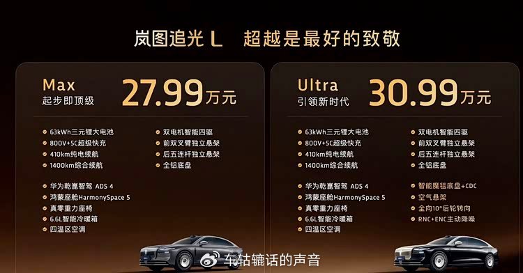 2025年12月10日晚,汽車宣布,旗下的正式上市,新車共推出了兩款車型,分別是Max版和Ultra版,售價則為27.99萬和30.99萬元。作為嵐圖品牌的旗艦車型,它采用了全新設計,提供雙拼色車身和“大餅式”輪轂可選,車長超過5.1米,軸距3010毫米。