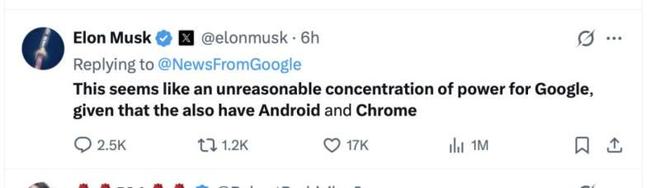 “考慮到谷歌已經控制了Android和Chrome,這樣的合作將導致不合理的權力集中。”馬斯克在X上寫道。