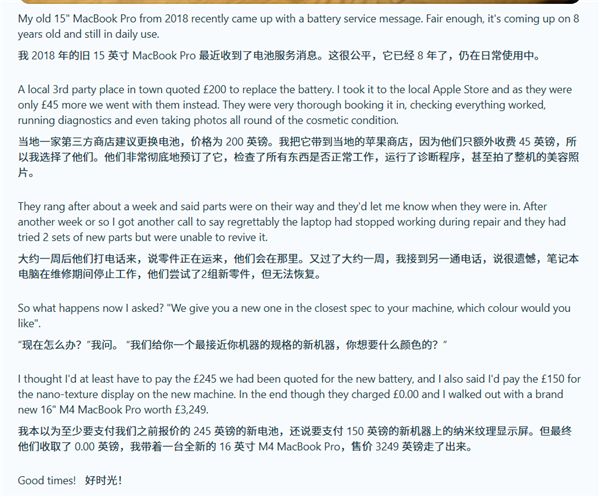 故事始于otto-mate那臺2018年款MacBook Pro收到了電池更換提示,他首先嘗試了第三方維修店,報價200英鎊,覺得太貴于是轉(zhuǎn)向官方蘋果店,員工報價45英鎊,但需等待一周來訂購所需零件。