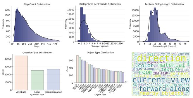 第一行分別展示了每條軌跡的路徑步數、對話輪數和每輪對話長度的頻率直方圖;第二行展示了問題類型與目標類型的統計結果,以及對話中高頻詞的詞云圖。