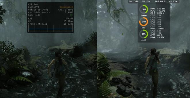 結果顯示,得益于芯片的強大算力,兩款設備在游戲過程中均未出現卡頓或幀率波動,始終穩定在 60FPS 的流暢水平。