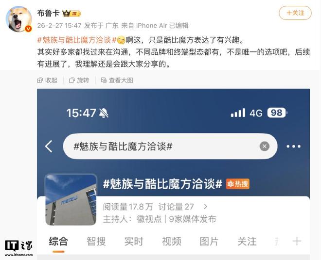 2 月 27 日消息,博主 @布魯卡 今天在微博談到了“魅族與酷比魔方洽談”事件并表示:
